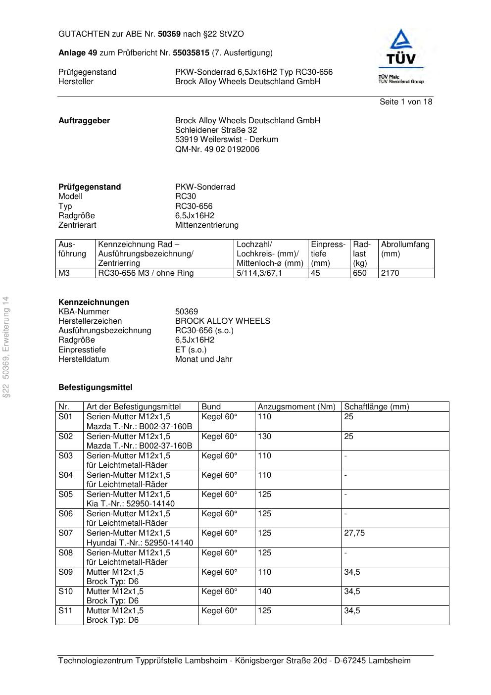 Dieses Gutachten (abe) bezieht sich auf die Alufelge Brock RC30-656 in der Ausführung 6.5Jx16 ET 0, Mittenloch 0 mm (KBA 50369). Im PDF findest du typischerweise zulässige Reifengrößen, Auflagen/Anbauhinweise und – je nach Dokument – Hinweise zur Eintragung.