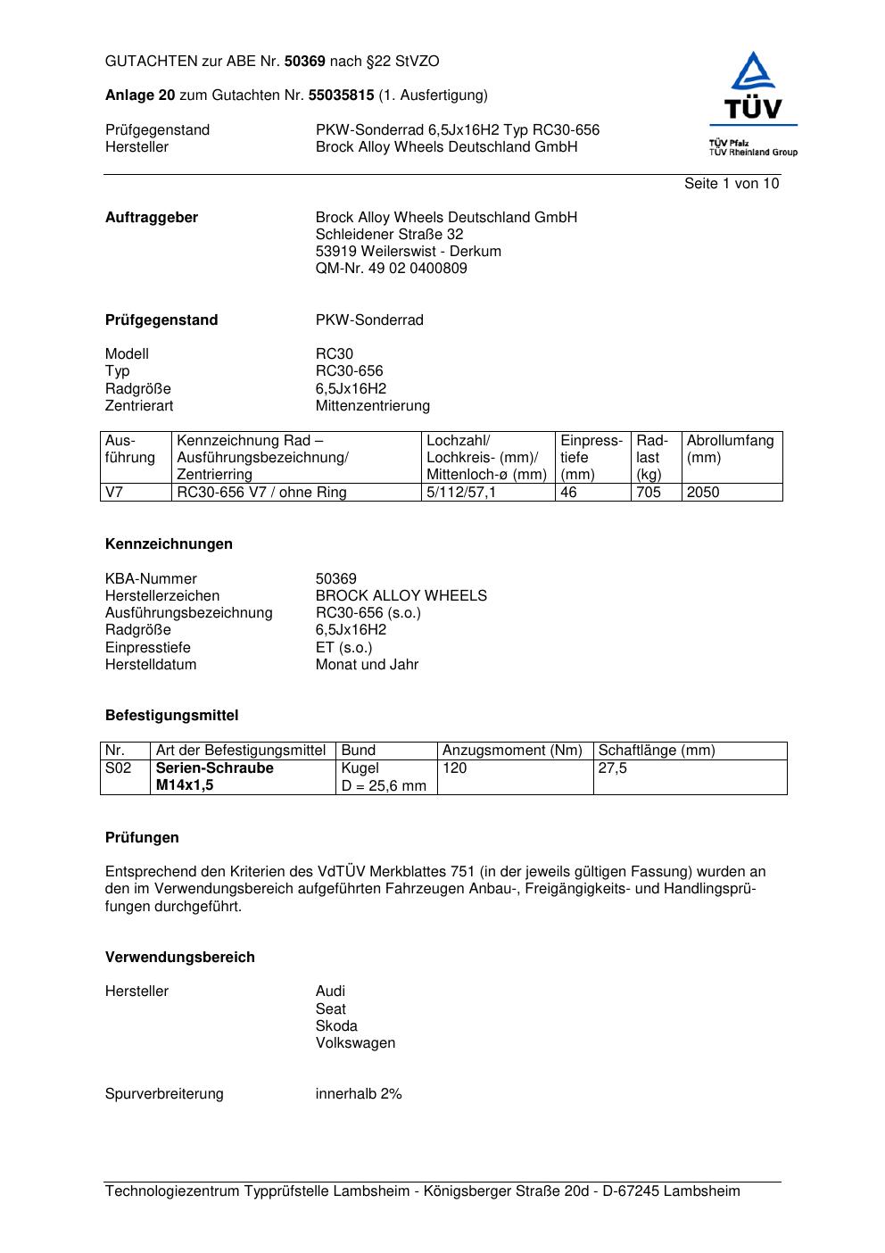 Dieses Gutachten (abe) bezieht sich auf die Alufelge Brock RC30-656 in der Ausführung 6.5Jx16 ET 0, Mittenloch 0 mm (KBA 50369). Im PDF findest du typischerweise zulässige Reifengrößen, Auflagen/Anbauhinweise und – je nach Dokument – Hinweise zur Eintragung.