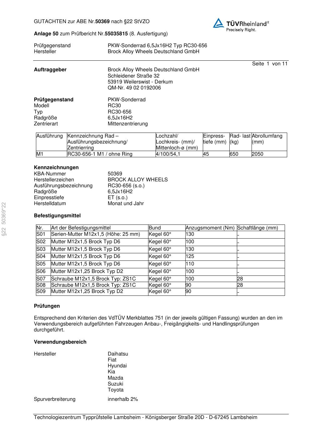 Dieses Gutachten (abe) bezieht sich auf die Alufelge Brock RC30-656 in der Ausführung 6.5Jx16 ET 0, Mittenloch 0 mm (KBA 50369). Im PDF findest du typischerweise zulässige Reifengrößen, Auflagen/Anbauhinweise und – je nach Dokument – Hinweise zur Eintragung.