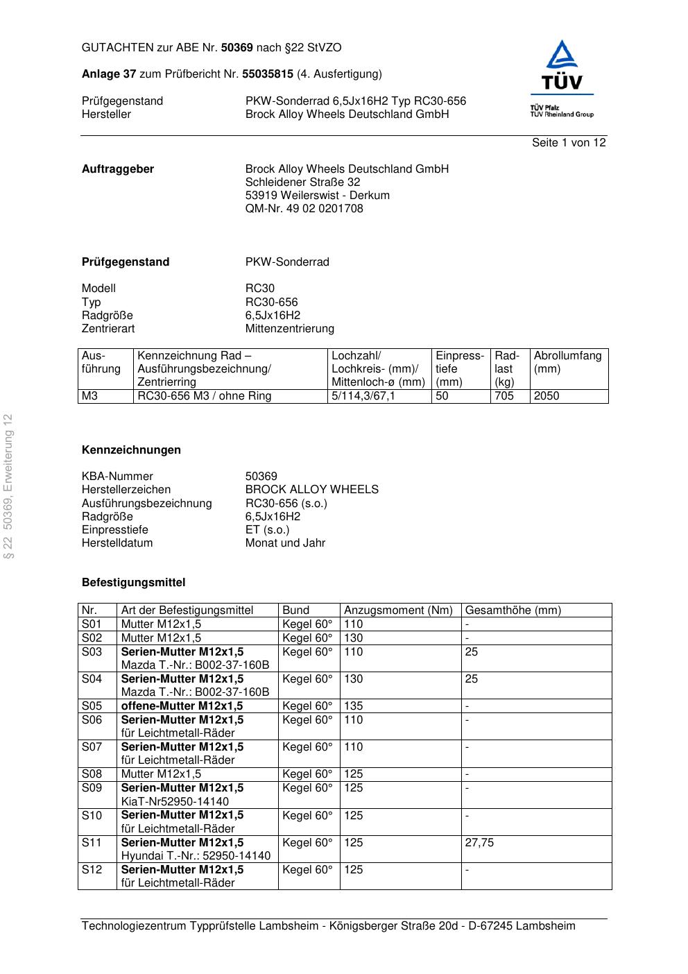 Dieses Gutachten (abe) bezieht sich auf die Alufelge Brock RC30-656 in der Ausführung 6.5Jx16 ET 0, Mittenloch 0 mm (KBA 50369). Im PDF findest du typischerweise zulässige Reifengrößen, Auflagen/Anbauhinweise und – je nach Dokument – Hinweise zur Eintragung.