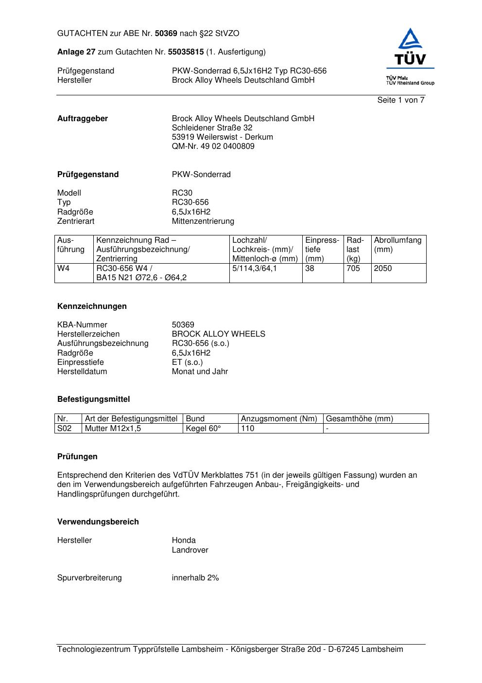 Dieses Gutachten (abe) bezieht sich auf die Alufelge Brock RC30-656 in der Ausführung 6.5Jx16 ET 0, Mittenloch 0 mm (KBA 50369). Im PDF findest du typischerweise zulässige Reifengrößen, Auflagen/Anbauhinweise und – je nach Dokument – Hinweise zur Eintragung.