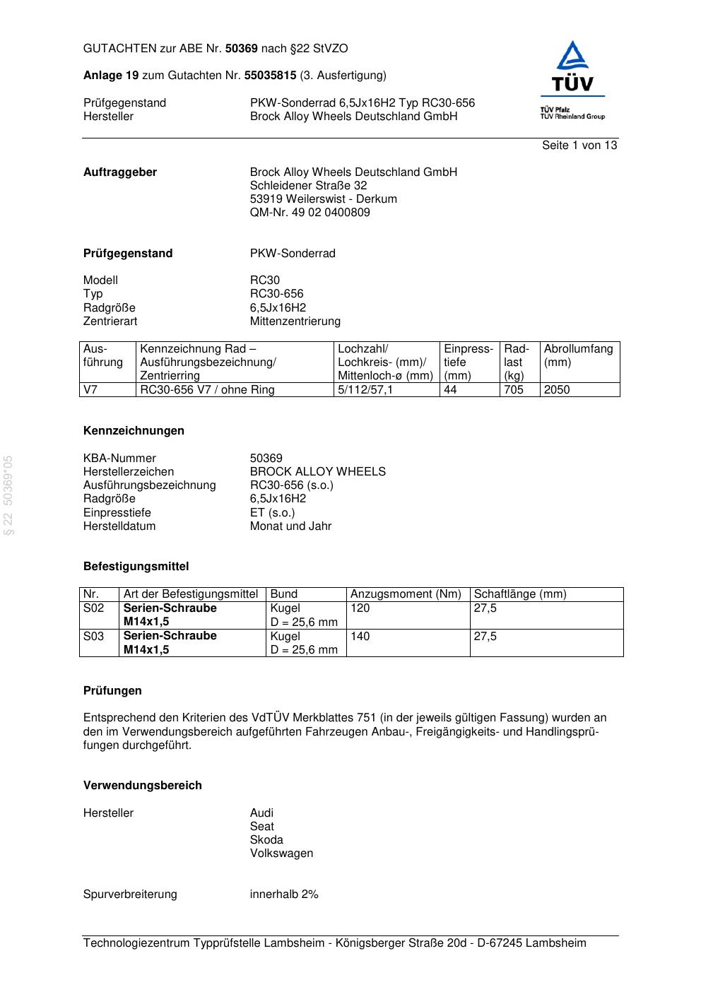 Dieses Gutachten (abe) bezieht sich auf die Alufelge Brock RC30-656 in der Ausführung 6.5Jx16 ET 0, Mittenloch 0 mm (KBA 50369). Im PDF findest du typischerweise zulässige Reifengrößen, Auflagen/Anbauhinweise und – je nach Dokument – Hinweise zur Eintragung.
