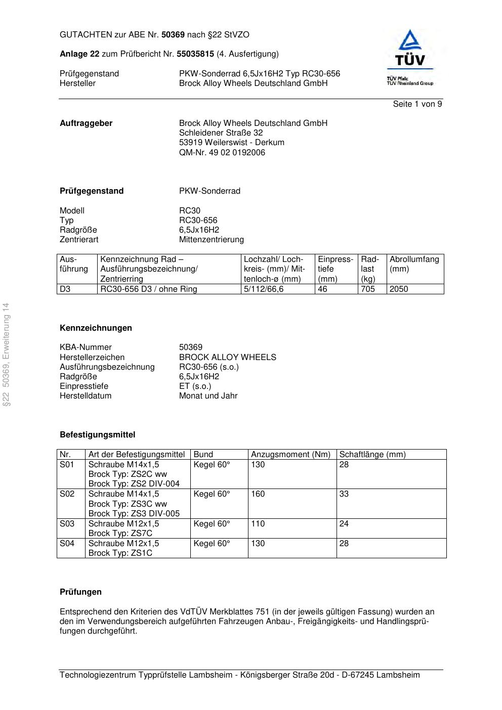 Dieses Gutachten (abe) bezieht sich auf die Alufelge Brock RC30-656 in der Ausführung 6.5Jx16 ET 0, Mittenloch 0 mm (KBA 50369). Im PDF findest du typischerweise zulässige Reifengrößen, Auflagen/Anbauhinweise und – je nach Dokument – Hinweise zur Eintragung.