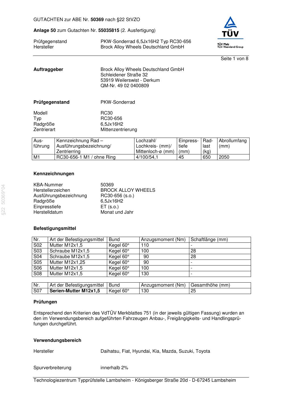 Dieses Gutachten (abe) bezieht sich auf die Alufelge Brock RC30-656 in der Ausführung 6.5Jx16 ET 0, Mittenloch 0 mm (KBA 50369). Im PDF findest du typischerweise zulässige Reifengrößen, Auflagen/Anbauhinweise und – je nach Dokument – Hinweise zur Eintragung.