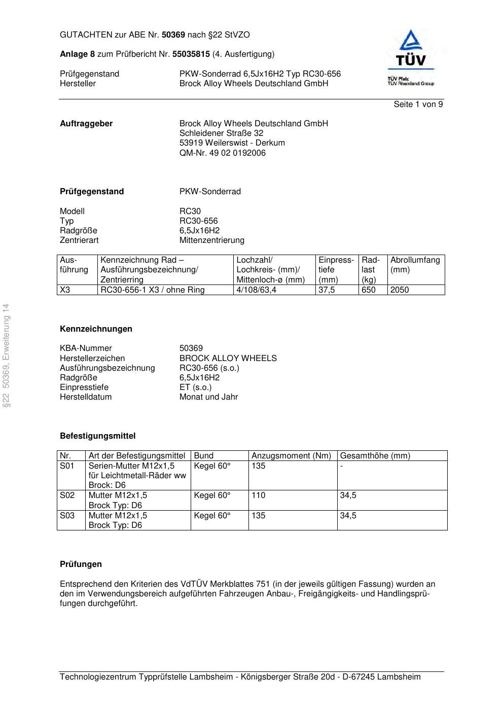 Dieses Gutachten (abe) bezieht sich auf die Alufelge Brock RC30-656 in der Ausführung 6.5Jx16 ET 0, Mittenloch 0 mm (KBA 50369). Im PDF findest du typischerweise zulässige Reifengrößen, Auflagen/Anbauhinweise und – je nach Dokument – Hinweise zur Eintragung.