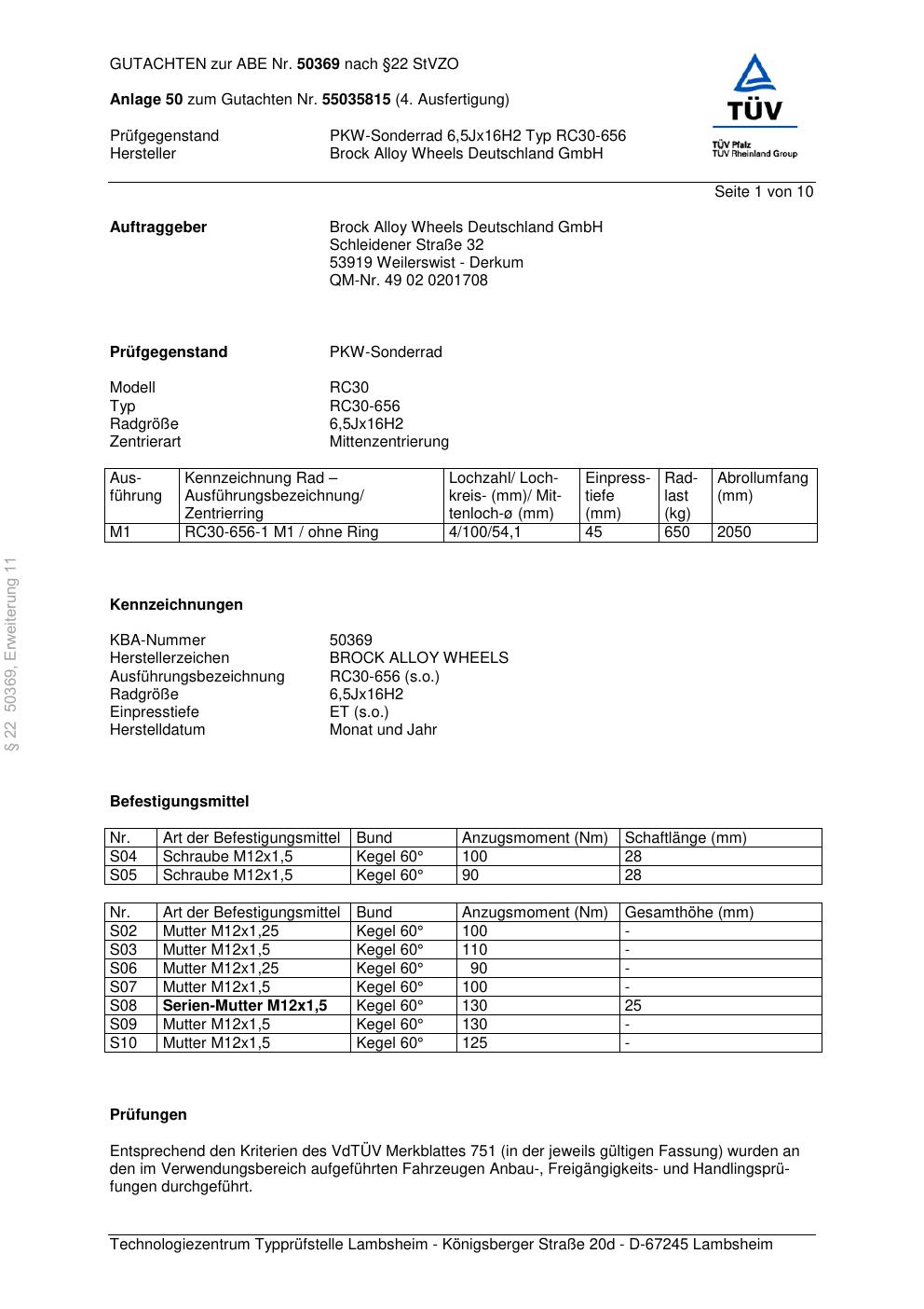 Dieses Gutachten (abe) bezieht sich auf die Alufelge Brock RC30-656 in der Ausführung 6.5Jx16 ET 0, Mittenloch 0 mm (KBA 50369). Im PDF findest du typischerweise zulässige Reifengrößen, Auflagen/Anbauhinweise und – je nach Dokument – Hinweise zur Eintragung.