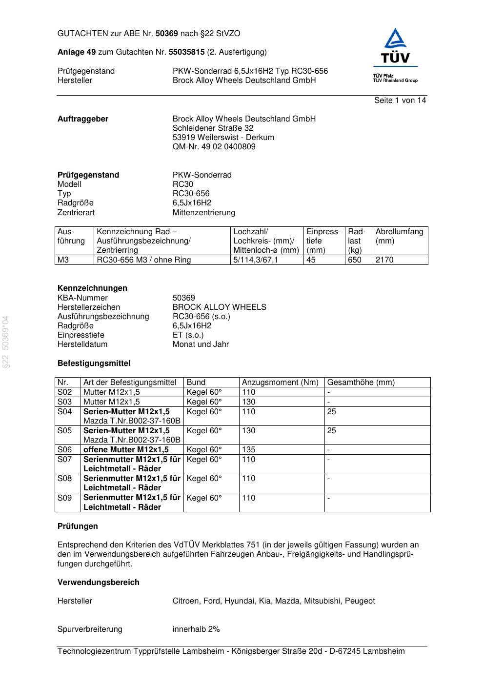 Dieses Gutachten (abe) bezieht sich auf die Alufelge Brock RC30-656 in der Ausführung 6.5Jx16 ET 0, Mittenloch 0 mm (KBA 50369). Im PDF findest du typischerweise zulässige Reifengrößen, Auflagen/Anbauhinweise und – je nach Dokument – Hinweise zur Eintragung.