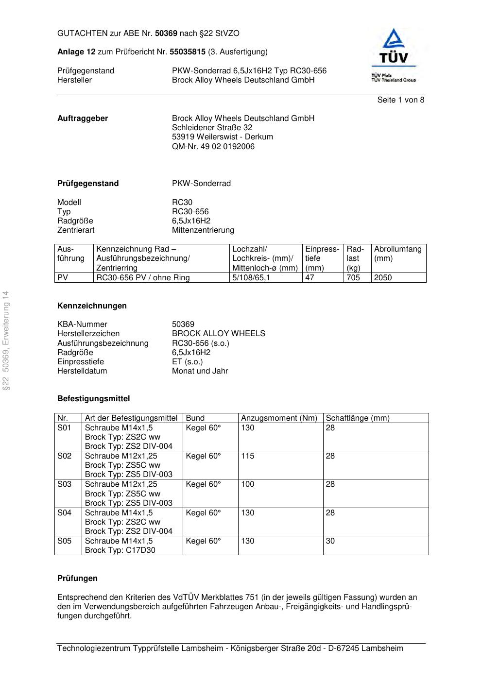 Dieses Gutachten (abe) bezieht sich auf die Alufelge Brock RC30-656 in der Ausführung 6.5Jx16 ET 0, Mittenloch 0 mm (KBA 50369). Im PDF findest du typischerweise zulässige Reifengrößen, Auflagen/Anbauhinweise und – je nach Dokument – Hinweise zur Eintragung.
