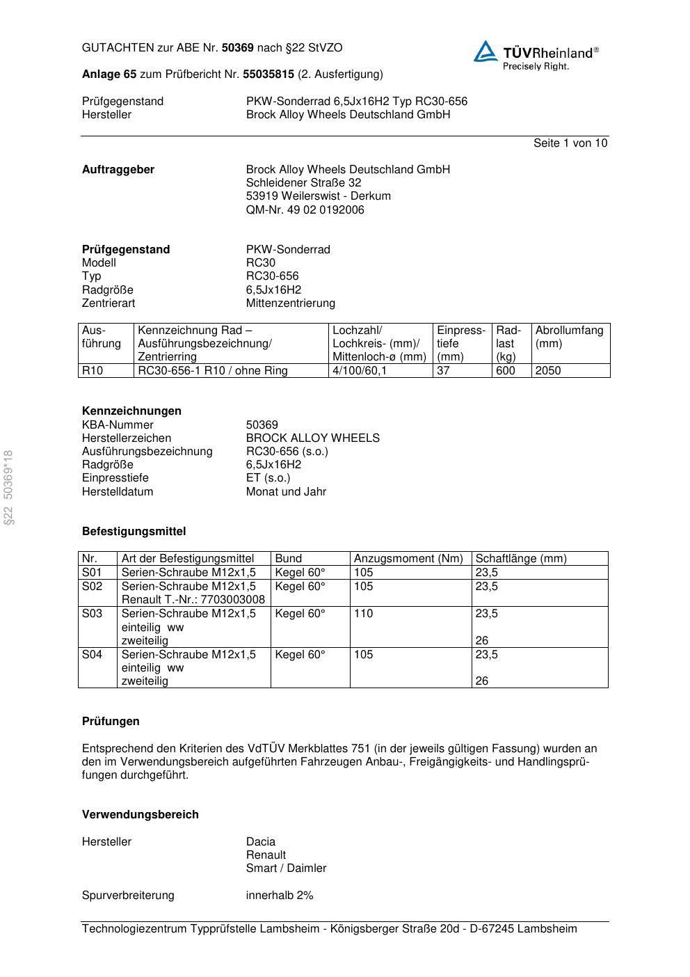 Felgengutachten / abe für Alufelgen Brock RC30-656 (6.5Jx16 ET 0, Mittenloch 0 mm) mit KBA 50369 (Zertifikatsnummer 50369). Hier kostenlos als PDF herunterladen. Der Download-Link ist 24 Stunden gültig und kann bis zu zwei Mal verwendet werden.