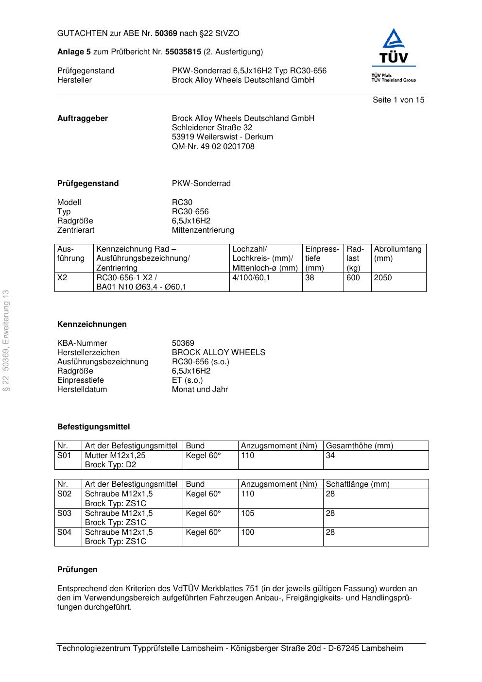 Felgengutachten / abe für Alufelgen Brock RC30-656 (6.5Jx16 ET 0, Mittenloch 0 mm) mit KBA 50369 (Zertifikatsnummer 50369). Hier kostenlos als PDF herunterladen. Der Download-Link ist 24 Stunden gültig und kann bis zu zwei Mal verwendet werden.