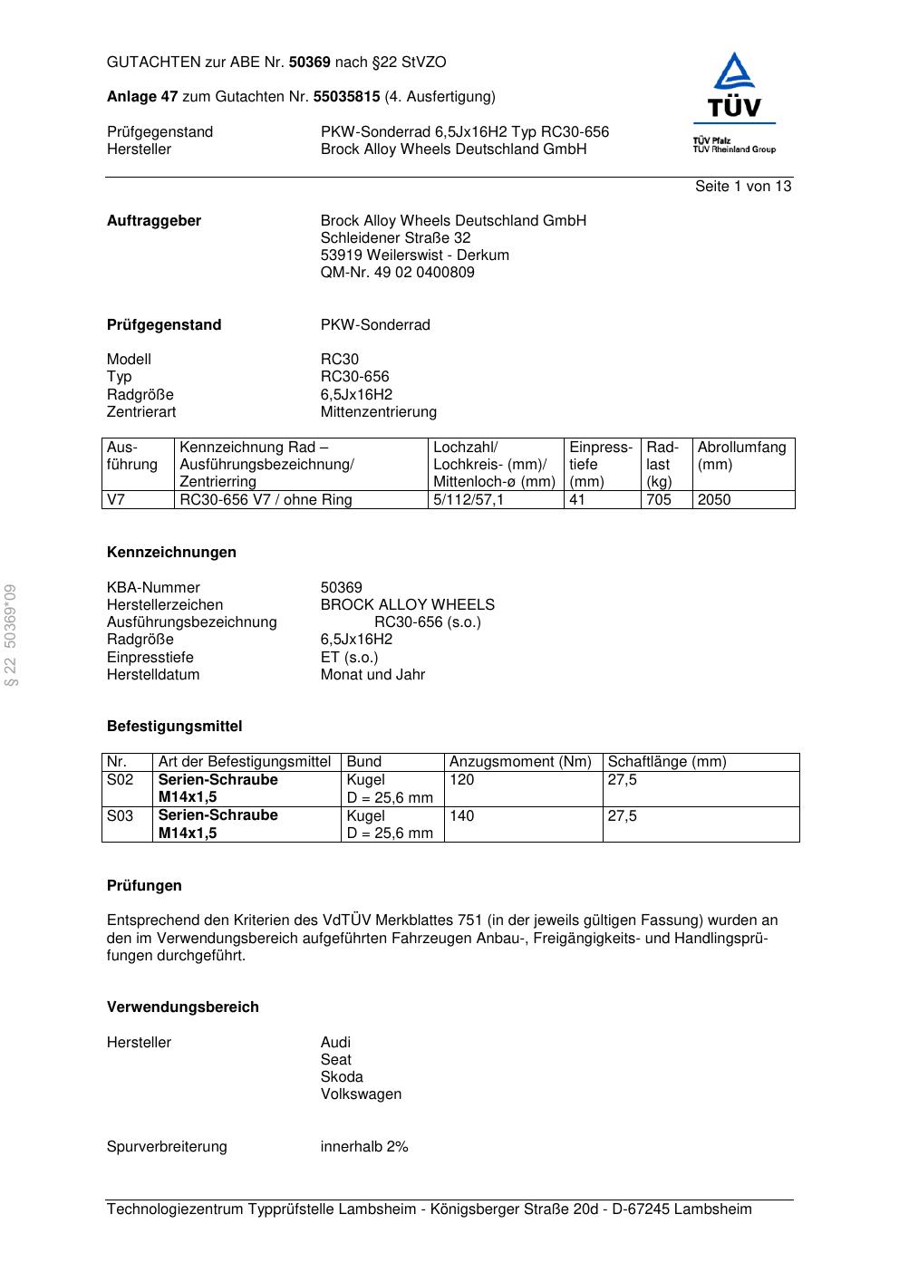 Dieses Gutachten (abe) bezieht sich auf die Alufelge Brock RC30-656 in der Ausführung 6.5Jx16 ET 0, Mittenloch 0 mm (KBA 50369). Im PDF findest du typischerweise zulässige Reifengrößen, Auflagen/Anbauhinweise und – je nach Dokument – Hinweise zur Eintragung.