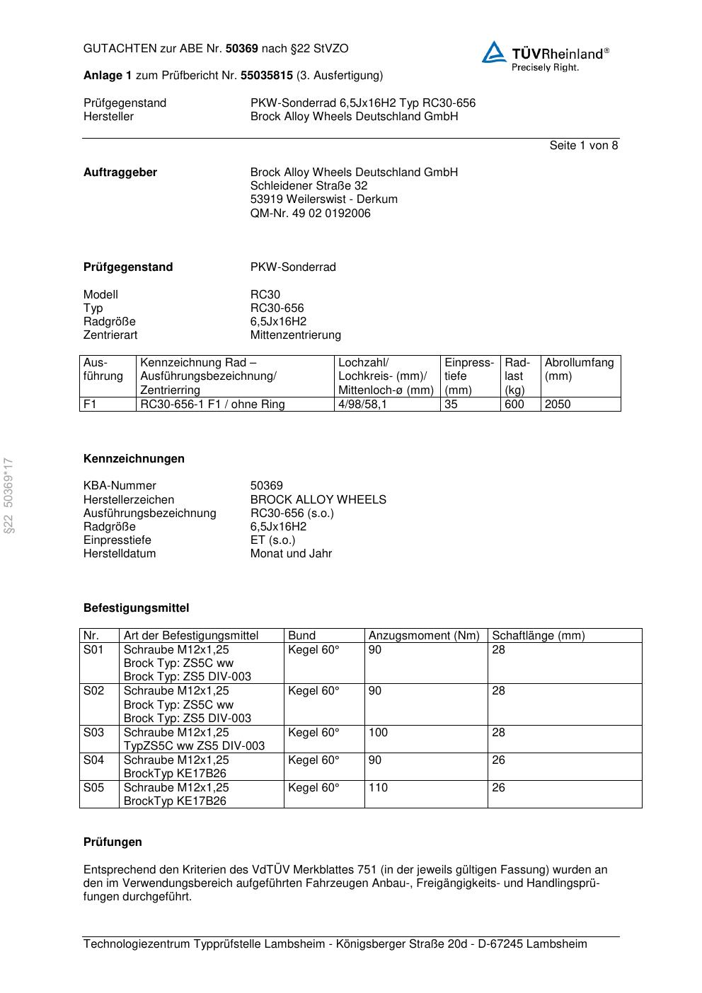 Felgengutachten / abe für Alufelgen Brock RC30-656 (6.5Jx16 ET 0, Mittenloch 0 mm) mit KBA 50369 (Zertifikatsnummer 50369). Hier kostenlos als PDF herunterladen. Der Download-Link ist 24 Stunden gültig und kann bis zu zwei Mal verwendet werden.