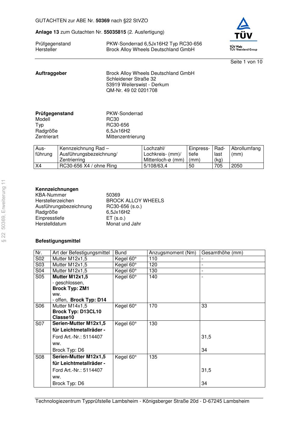 Felgengutachten / abe für Alufelgen Brock RC30-656 (6.5Jx16 ET 0, Mittenloch 0 mm) mit KBA 50369 (Zertifikatsnummer 50369). Hier kostenlos als PDF herunterladen. Der Download-Link ist 24 Stunden gültig und kann bis zu zwei Mal verwendet werden.