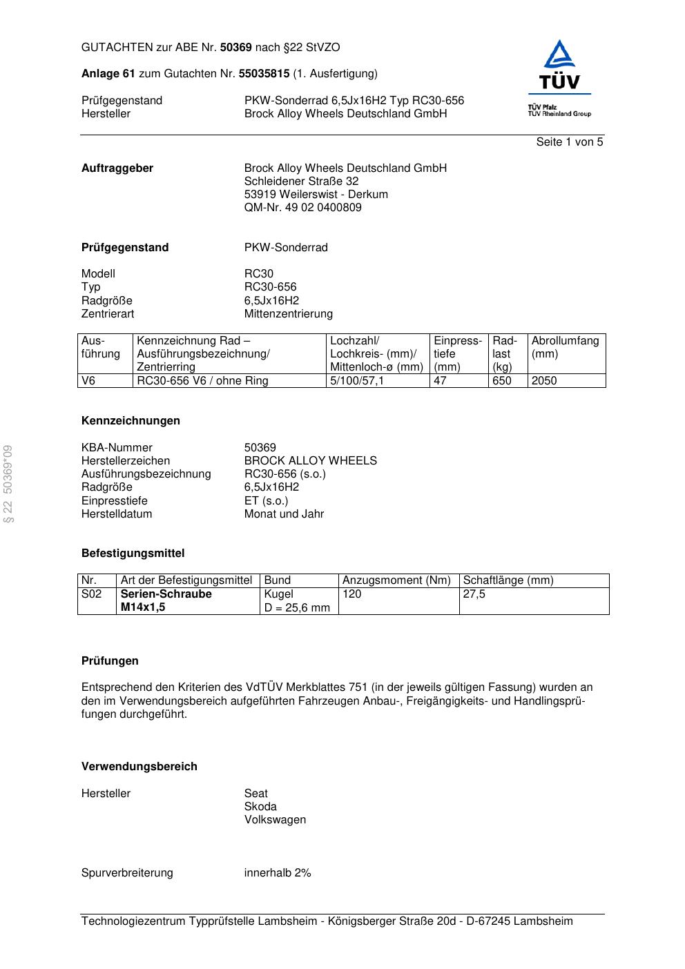 Dieses Gutachten (abe) bezieht sich auf die Alufelge Brock RC30-656 in der Ausführung 6.5Jx16 ET 0, Mittenloch 0 mm (KBA 50369). Im PDF findest du typischerweise zulässige Reifengrößen, Auflagen/Anbauhinweise und – je nach Dokument – Hinweise zur Eintragung.