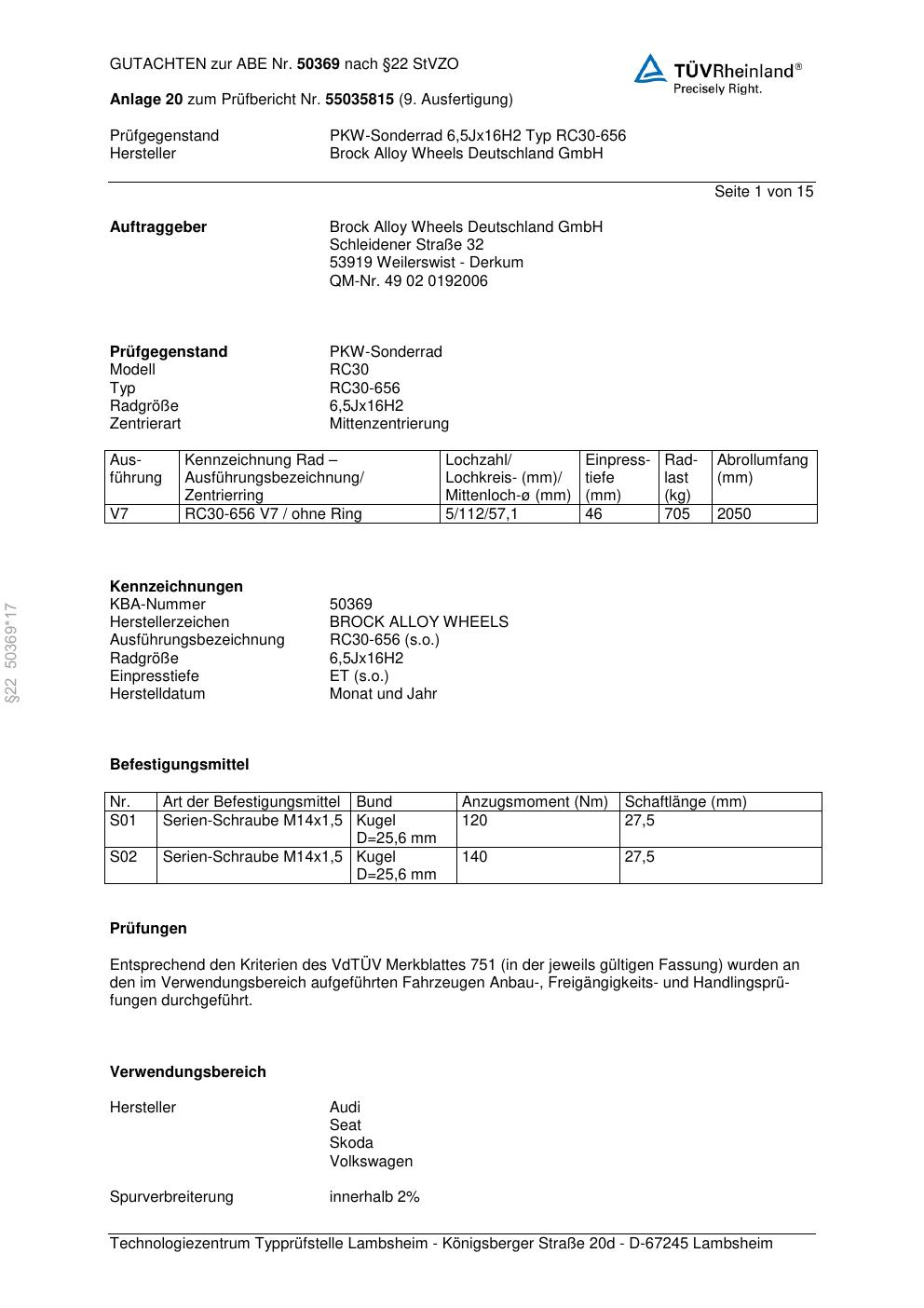 Dieses Gutachten (abe) bezieht sich auf die Alufelge Brock RC30-656 in der Ausführung 6.5Jx16 ET 0, Mittenloch 0 mm (KBA 50369). Im PDF findest du typischerweise zulässige Reifengrößen, Auflagen/Anbauhinweise und – je nach Dokument – Hinweise zur Eintragung.