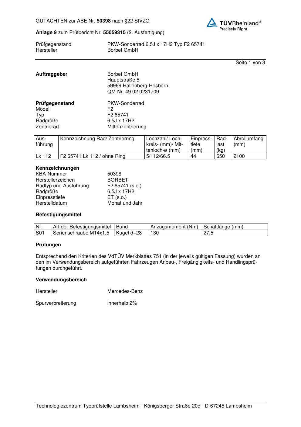 Dieses Gutachten (abe) bezieht sich auf die Alufelge Borbet F2 657 41 in der Ausführung 6.5Jx17 ET 0, Mittenloch 0 mm (KBA 50398). Im PDF findest du typischerweise zulässige Reifengrößen, Auflagen/Anbauhinweise und – je nach Dokument – Hinweise zur Eintragung.