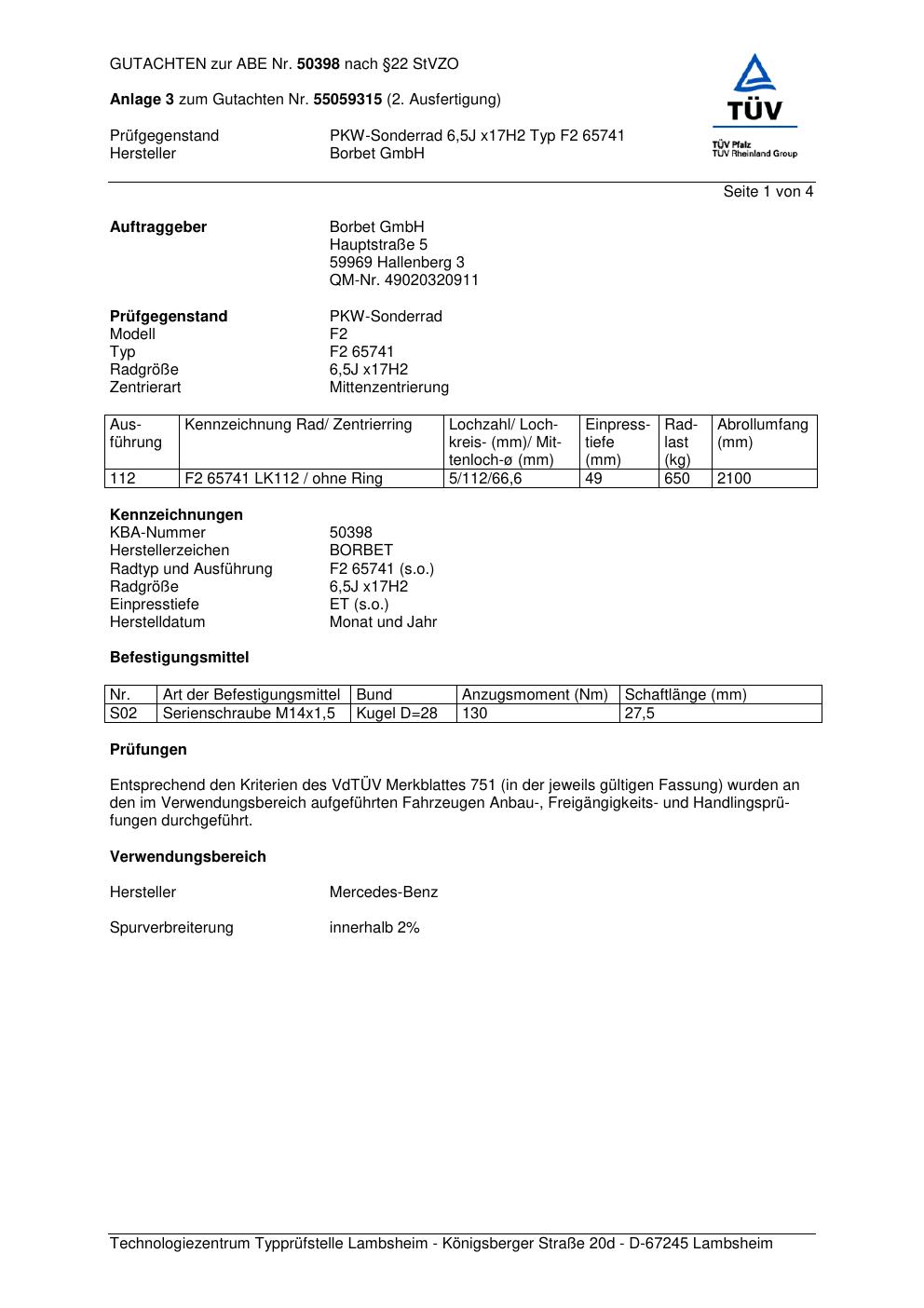 Dieses Gutachten (abe) bezieht sich auf die Alufelge Borbet F2 6574 1 in der Ausführung 6.5Jx17 ET 0, Mittenloch 0 mm (KBA 50398). Im PDF findest du typischerweise zulässige Reifengrößen, Auflagen/Anbauhinweise und – je nach Dokument – Hinweise zur Eintragung.