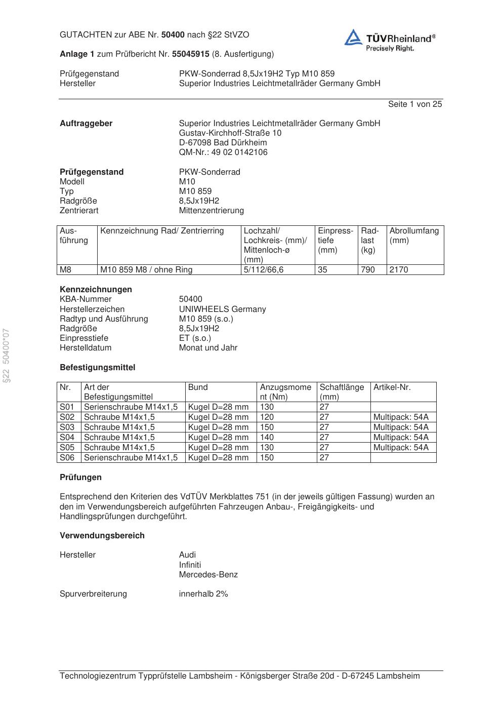 Dieses Gutachten (abe) bezieht sich auf die Alufelge Superior M10 859 in der Ausführung 8.5Jx19 ET 0, Mittenloch 0 mm (KBA 50400). Im PDF findest du typischerweise zulässige Reifengrößen, Auflagen/Anbauhinweise und – je nach Dokument – Hinweise zur Eintragung.