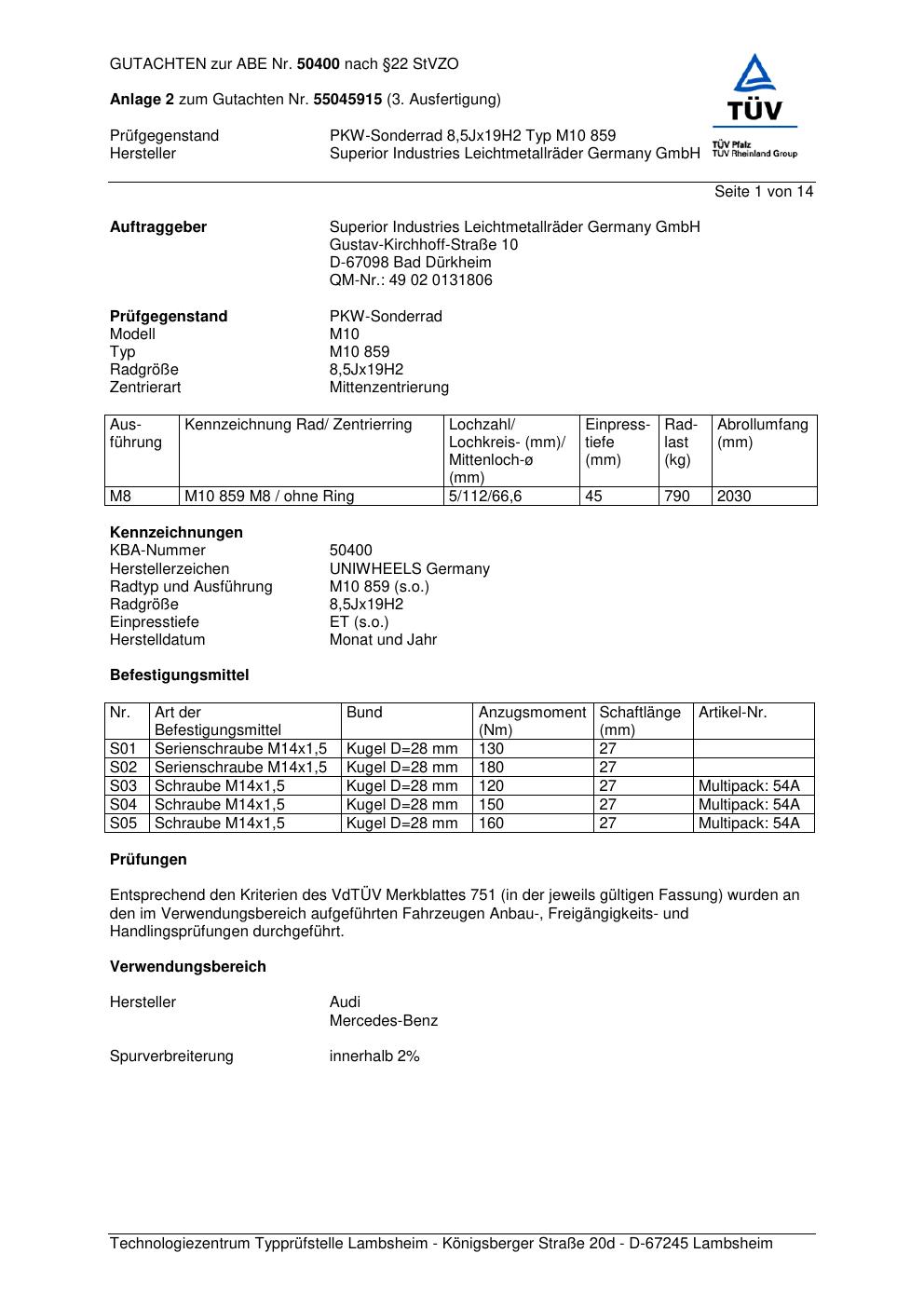 Dieses Gutachten (abe) bezieht sich auf die Alufelge Superior M10 859 in der Ausführung 8.5Jx19 ET 0, Mittenloch 0 mm (KBA 50400). Im PDF findest du typischerweise zulässige Reifengrößen, Auflagen/Anbauhinweise und – je nach Dokument – Hinweise zur Eintragung.