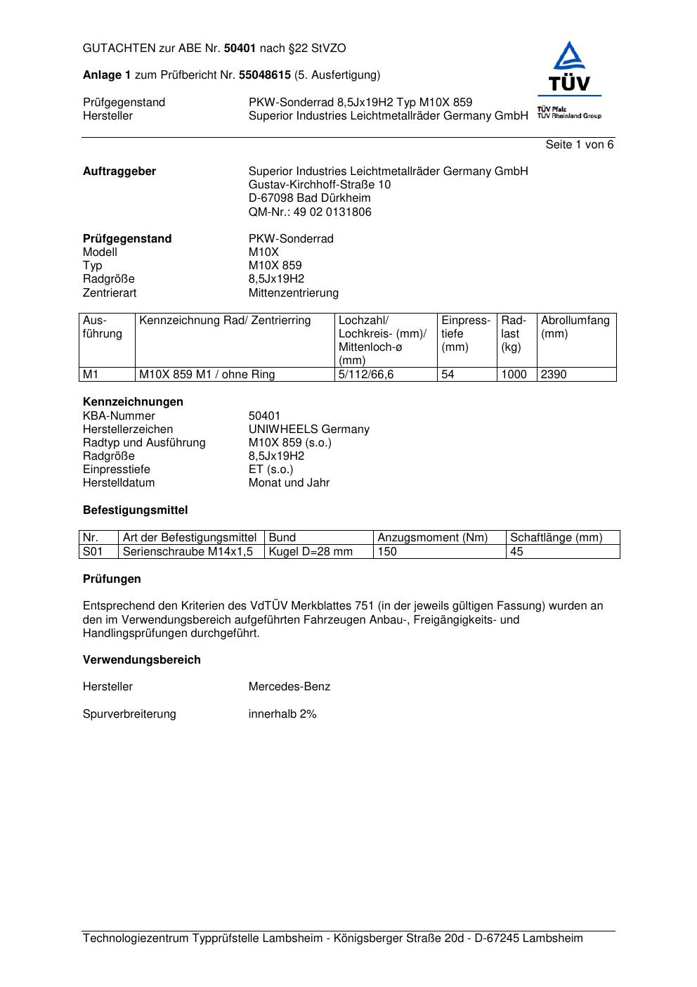 Dieses Gutachten (abe) bezieht sich auf die Alufelge Superior M10X 859 in der Ausführung 8.5Jx19 ET 0, Mittenloch 0 mm (KBA 50401). Im PDF findest du typischerweise zulässige Reifengrößen, Auflagen/Anbauhinweise und – je nach Dokument – Hinweise zur Eintragung.