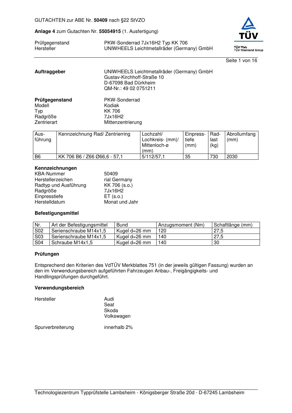 Dieses Gutachten (abe) bezieht sich auf die Alufelge brand-rial KK 706 in der Ausführung 7Jx16 ET 0, Mittenloch 0 mm (KBA 50409). Im PDF findest du typischerweise zulässige Reifengrößen, Auflagen/Anbauhinweise und – je nach Dokument – Hinweise zur Eintragung.