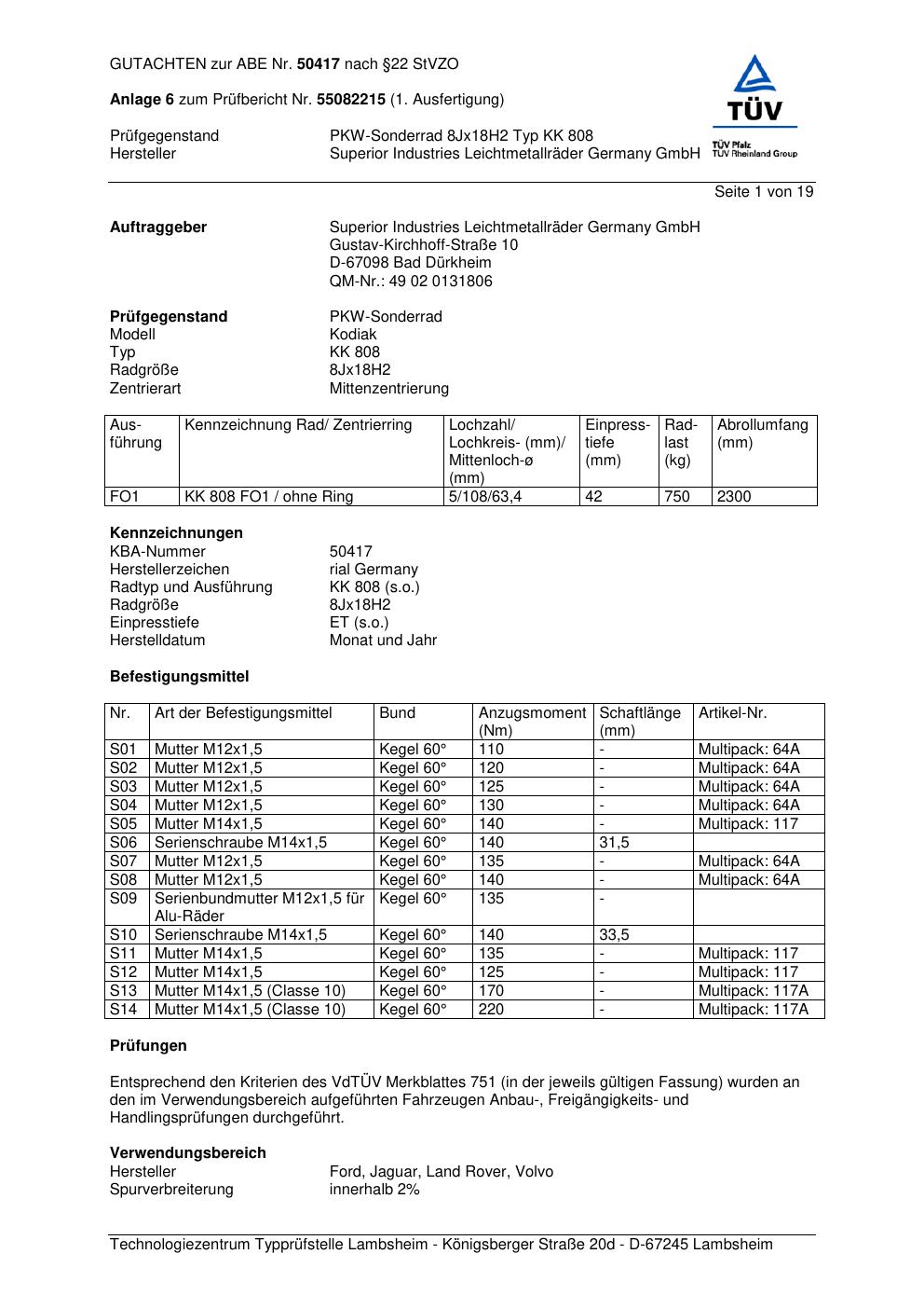 Dieses Gutachten (abe) bezieht sich auf die Alufelge brand-rial KK 808 in der Ausführung 8Jx18 ET 0, Mittenloch 0 mm (KBA 50417). Im PDF findest du typischerweise zulässige Reifengrößen, Auflagen/Anbauhinweise und – je nach Dokument – Hinweise zur Eintragung.