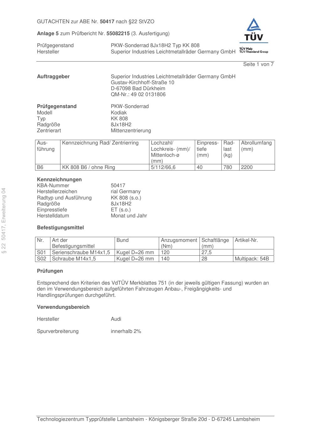 Dieses Gutachten (abe) bezieht sich auf die Alufelge brand-rial KK 808 in der Ausführung 8Jx18 ET 0, Mittenloch 0 mm (KBA 50417). Im PDF findest du typischerweise zulässige Reifengrößen, Auflagen/Anbauhinweise und – je nach Dokument – Hinweise zur Eintragung.