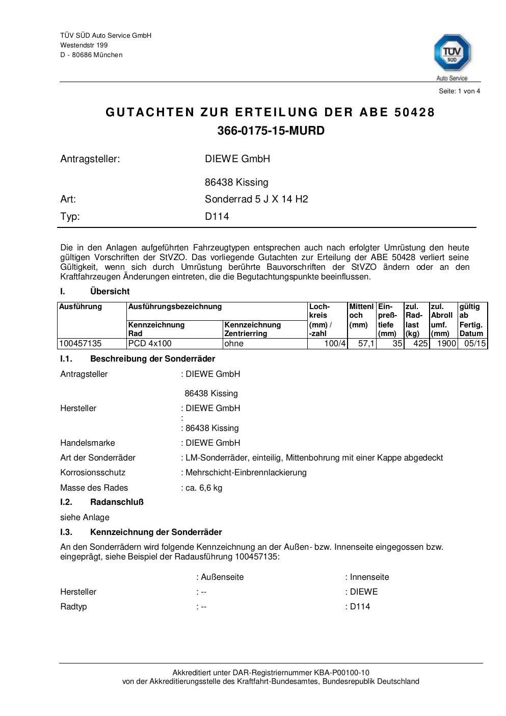 Dieses Gutachten (abe) bezieht sich auf die Alufelge co-diewe D114 in der Ausführung 5Jx14 ET 0, Mittenloch 0 mm (KBA 50428). Im PDF findest du typischerweise zulässige Reifengrößen, Auflagen/Anbauhinweise und – je nach Dokument – Hinweise zur Eintragung.