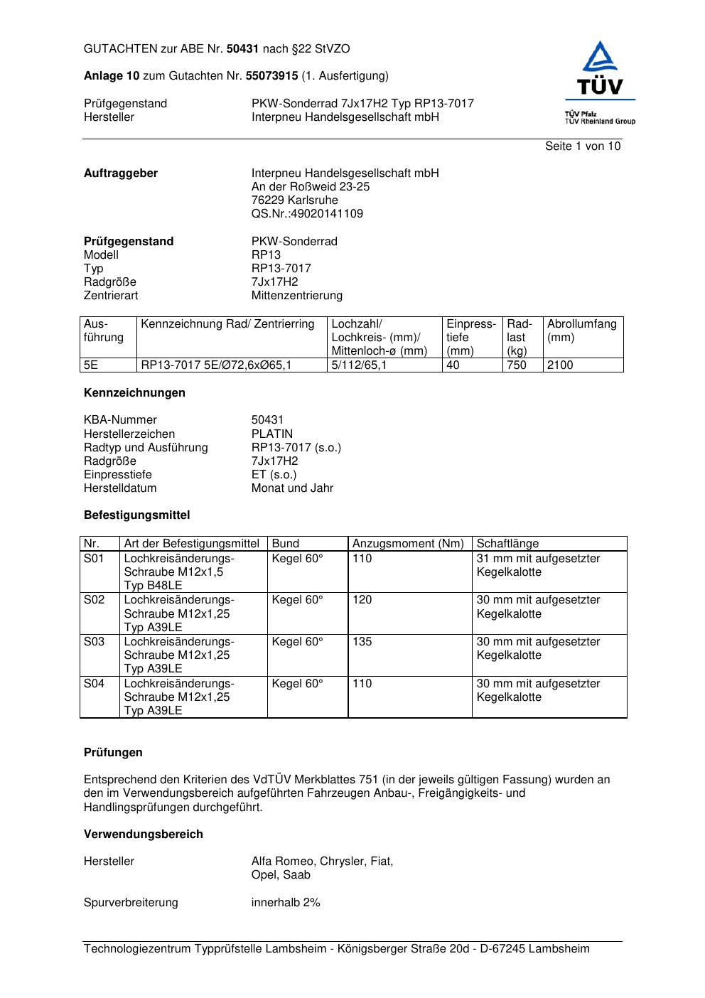 Dieses Gutachten (abe) bezieht sich auf die Alufelge Platin RP13-7017 in der Ausführung 7Jx17 ET 0, Mittenloch 0 mm (KBA 50431). Im PDF findest du typischerweise zulässige Reifengrößen, Auflagen/Anbauhinweise und – je nach Dokument – Hinweise zur Eintragung.