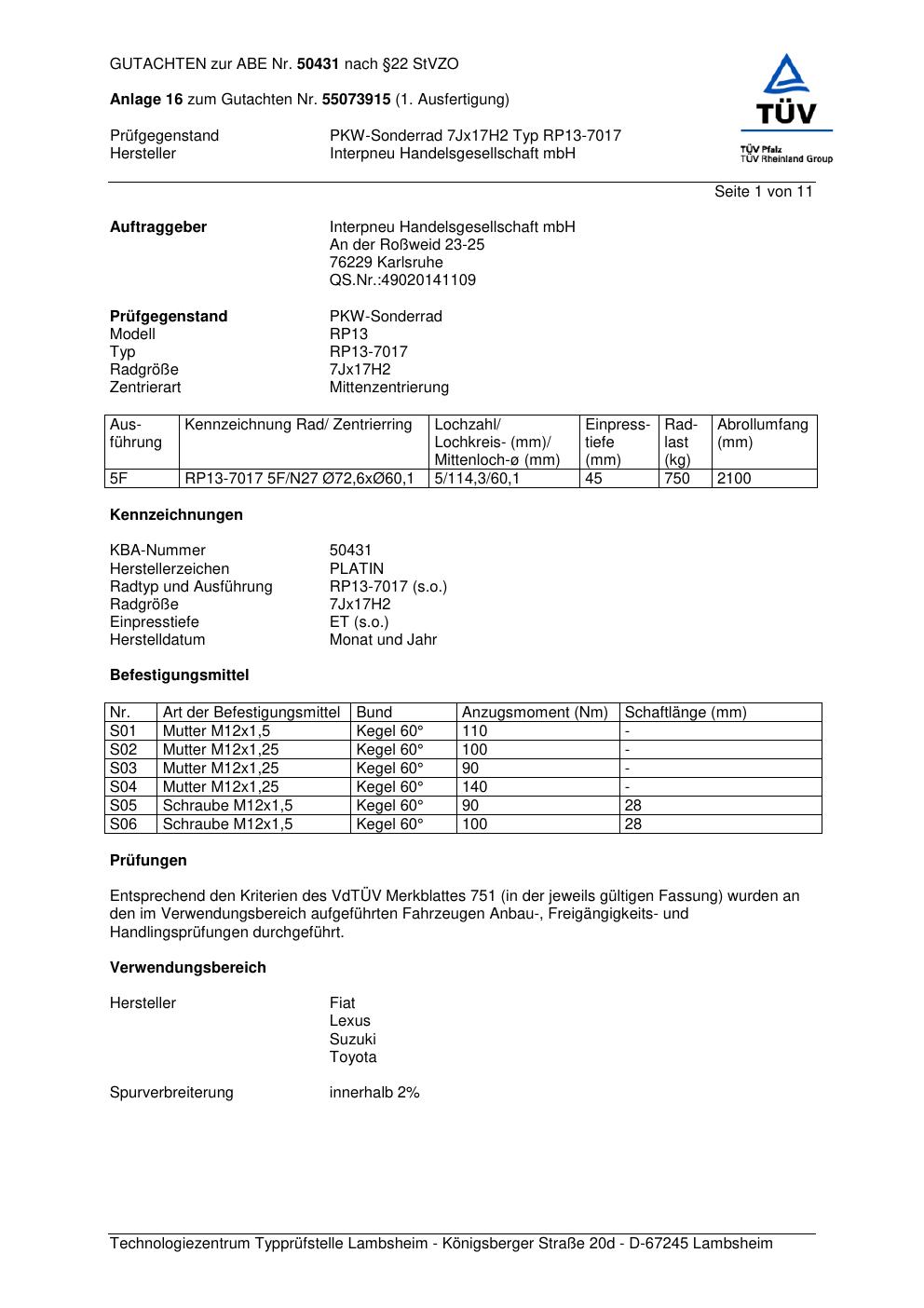 Dieses Gutachten (abe) bezieht sich auf die Alufelge Platin RP13-7017 in der Ausführung 7Jx17 ET 0, Mittenloch 0 mm (KBA 50431). Im PDF findest du typischerweise zulässige Reifengrößen, Auflagen/Anbauhinweise und – je nach Dokument – Hinweise zur Eintragung.