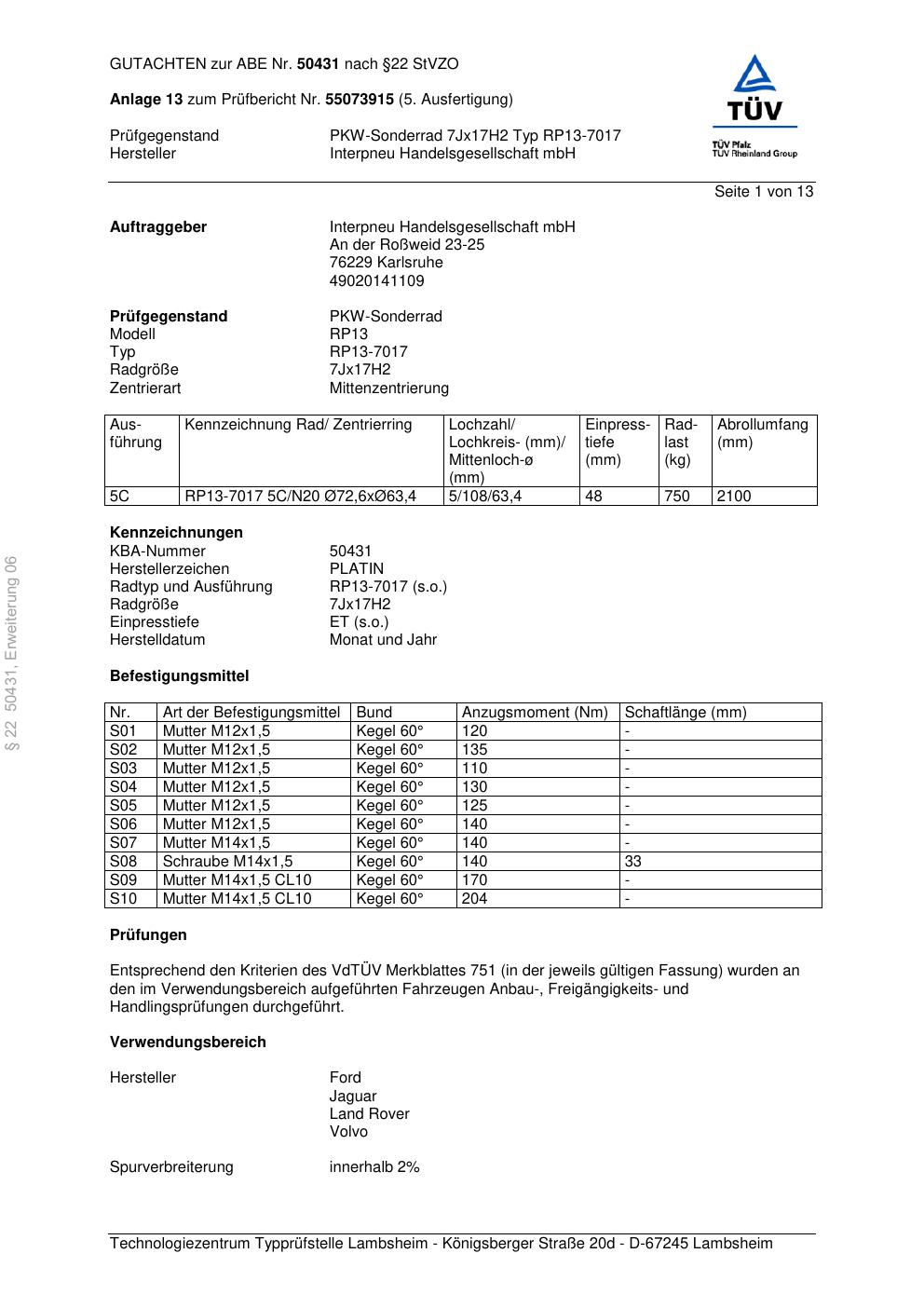 Dieses Gutachten (abe) bezieht sich auf die Alufelge Platin RP13-7017 in der Ausführung 7Jx17 ET 0, Mittenloch 0 mm (KBA 50431). Im PDF findest du typischerweise zulässige Reifengrößen, Auflagen/Anbauhinweise und – je nach Dokument – Hinweise zur Eintragung.