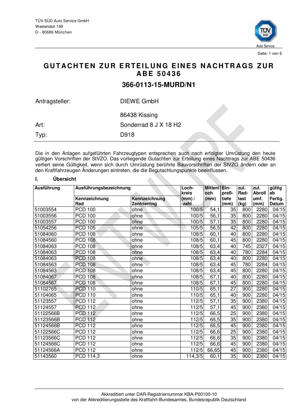 Dieses Gutachten (abe) bezieht sich auf die Alufelge Diewe D918 in der Ausführung 8Jx18 ET 0, Mittenloch 0 mm (KBA 50436). Im PDF findest du typischerweise zulässige Reifengrößen, Auflagen/Anbauhinweise und – je nach Dokument – Hinweise zur Eintragung.