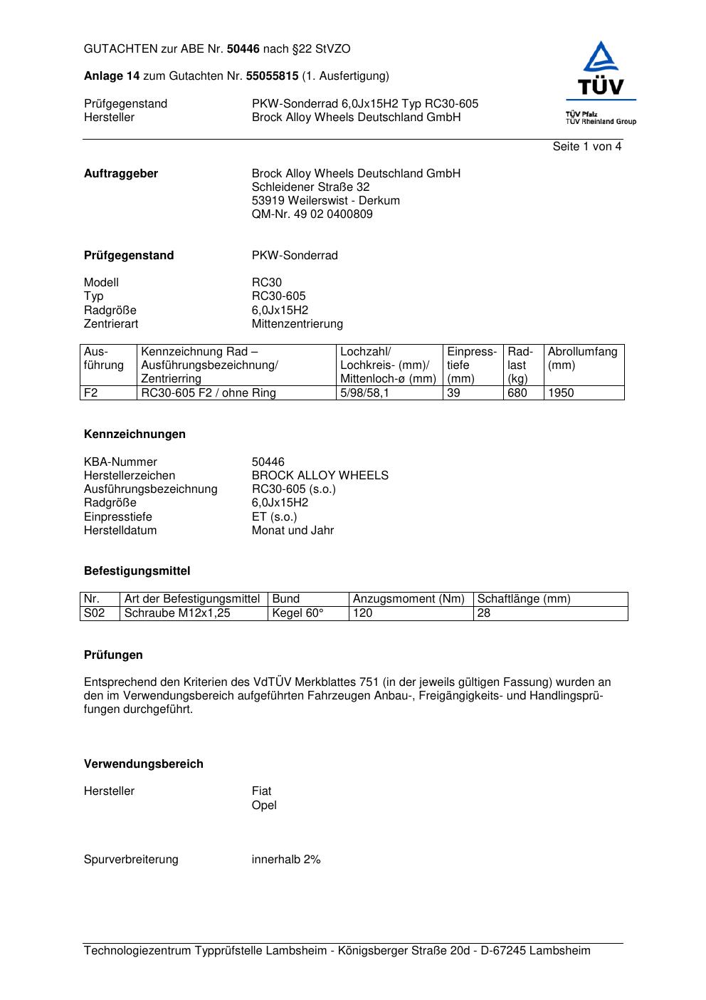 Dieses Gutachten (abe) bezieht sich auf die Alufelge Brock RC30-605 in der Ausführung 6Jx15 ET 0, Mittenloch 0 mm (KBA 50446). Im PDF findest du typischerweise zulässige Reifengrößen, Auflagen/Anbauhinweise und – je nach Dokument – Hinweise zur Eintragung.