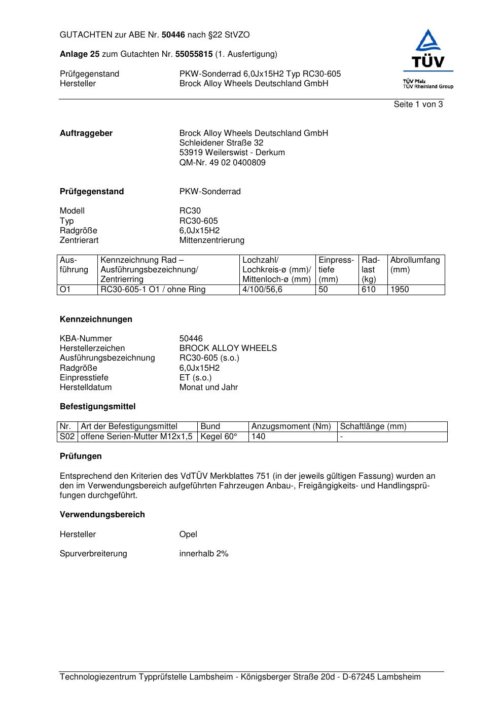 Dieses Gutachten (abe) bezieht sich auf die Alufelge Brock RC30-605 in der Ausführung 6Jx15 ET 0, Mittenloch 0 mm (KBA 50446). Im PDF findest du typischerweise zulässige Reifengrößen, Auflagen/Anbauhinweise und – je nach Dokument – Hinweise zur Eintragung.