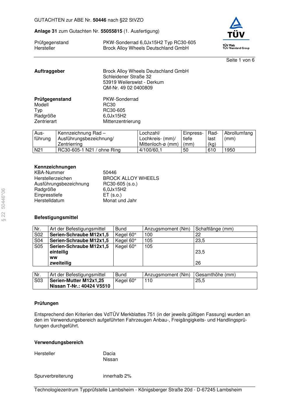 Dieses Gutachten (abe) bezieht sich auf die Alufelge Brock RC30-605 in der Ausführung 6Jx15 ET 0, Mittenloch 0 mm (KBA 50446). Im PDF findest du typischerweise zulässige Reifengrößen, Auflagen/Anbauhinweise und – je nach Dokument – Hinweise zur Eintragung.