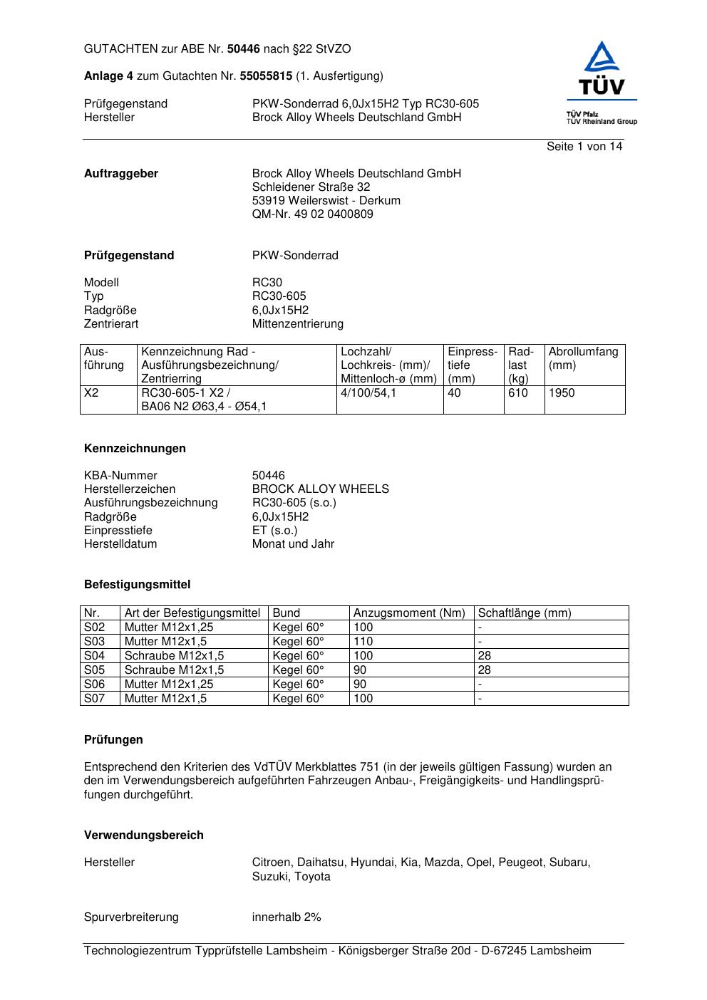 Dieses Gutachten (abe) bezieht sich auf die Alufelge Brock RC30-605 in der Ausführung 6Jx15 ET 0, Mittenloch 0 mm (KBA 50446). Im PDF findest du typischerweise zulässige Reifengrößen, Auflagen/Anbauhinweise und – je nach Dokument – Hinweise zur Eintragung.