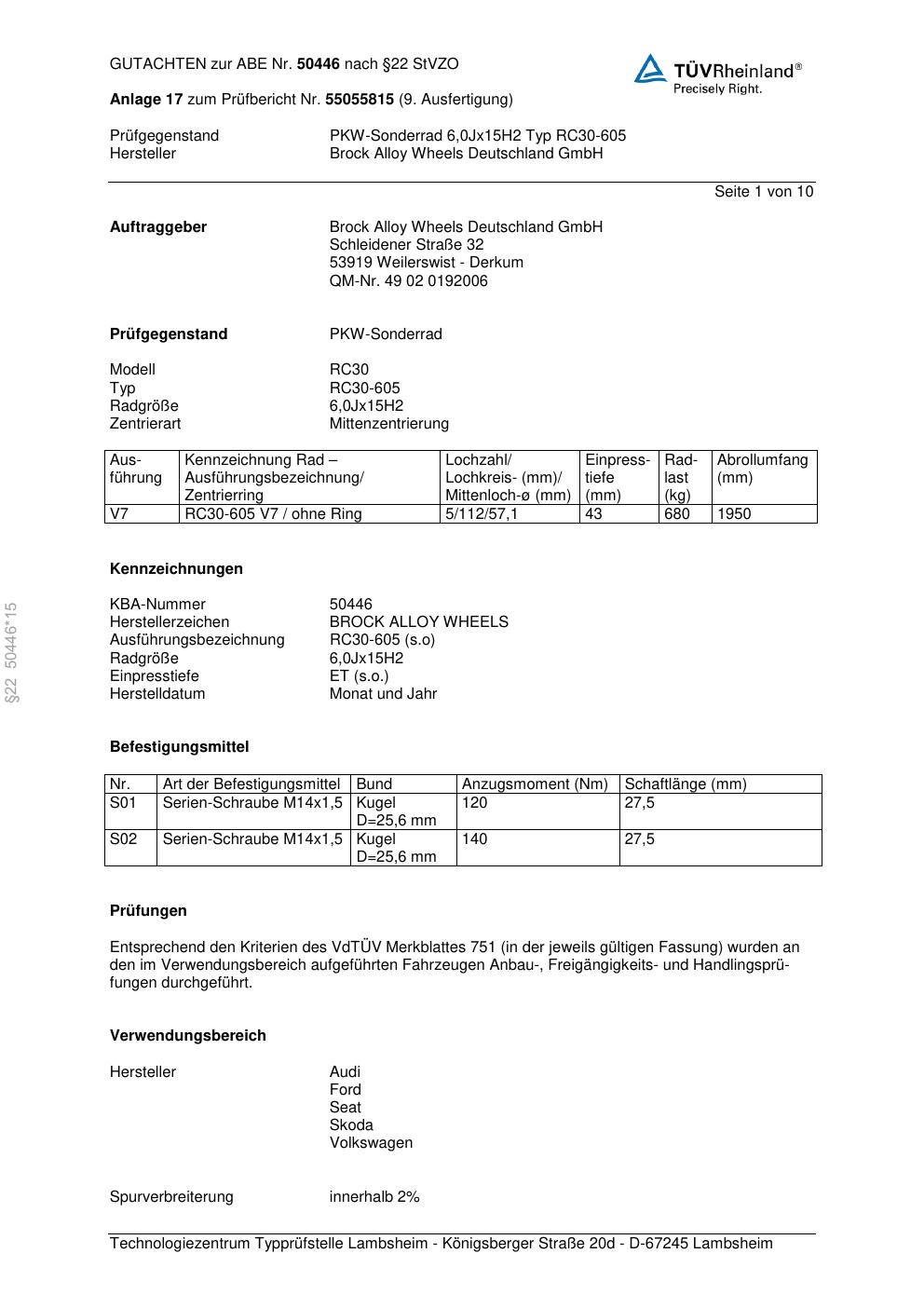 Dieses Gutachten (abe) bezieht sich auf die Alufelge Brock RC30-605 in der Ausführung 6Jx15 ET 0, Mittenloch 0 mm (KBA 50446). Im PDF findest du typischerweise zulässige Reifengrößen, Auflagen/Anbauhinweise und – je nach Dokument – Hinweise zur Eintragung.