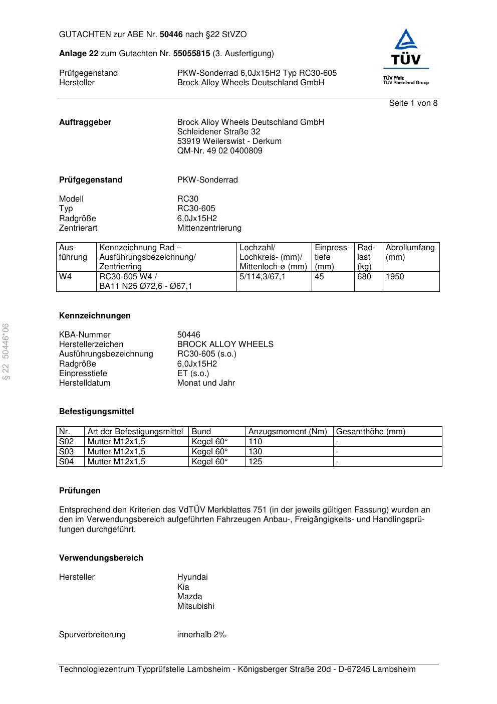 Dieses Gutachten (abe) bezieht sich auf die Alufelge Brock RC30-605 in der Ausführung 6Jx15 ET 0, Mittenloch 0 mm (KBA 50446). Im PDF findest du typischerweise zulässige Reifengrößen, Auflagen/Anbauhinweise und – je nach Dokument – Hinweise zur Eintragung.