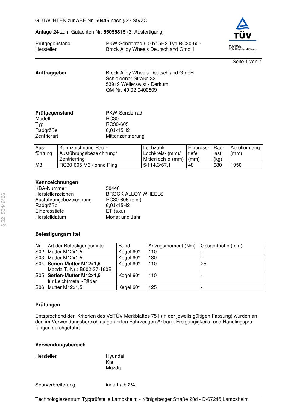 Dieses Gutachten (abe) bezieht sich auf die Alufelge Brock RC30-605 in der Ausführung 6Jx15 ET 0, Mittenloch 0 mm (KBA 50446). Im PDF findest du typischerweise zulässige Reifengrößen, Auflagen/Anbauhinweise und – je nach Dokument – Hinweise zur Eintragung.