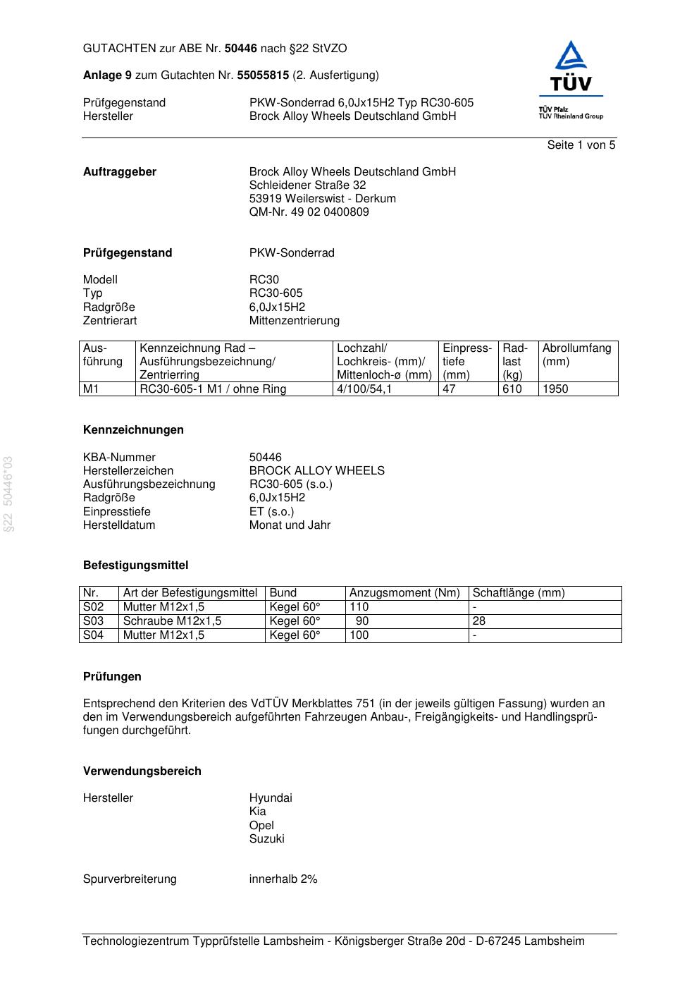 Dieses Gutachten (abe) bezieht sich auf die Alufelge Brock RC30-605 in der Ausführung 6Jx15 ET 0, Mittenloch 0 mm (KBA 50446). Im PDF findest du typischerweise zulässige Reifengrößen, Auflagen/Anbauhinweise und – je nach Dokument – Hinweise zur Eintragung.