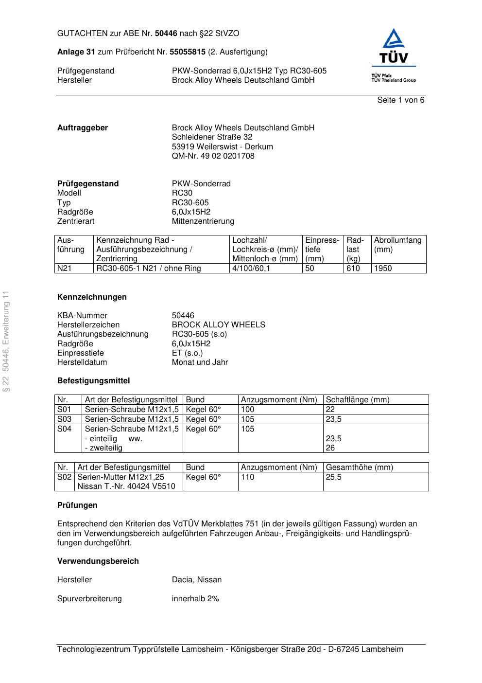 Dieses Gutachten (abe) bezieht sich auf die Alufelge Brock RC30-605 in der Ausführung 6Jx15 ET 0, Mittenloch 0 mm (KBA 50446). Im PDF findest du typischerweise zulässige Reifengrößen, Auflagen/Anbauhinweise und – je nach Dokument – Hinweise zur Eintragung.