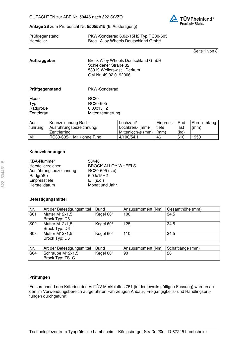 Dieses Gutachten (abe) bezieht sich auf die Alufelge Brock RC30-605 in der Ausführung 6Jx15 ET 0, Mittenloch 0 mm (KBA 50446). Im PDF findest du typischerweise zulässige Reifengrößen, Auflagen/Anbauhinweise und – je nach Dokument – Hinweise zur Eintragung.