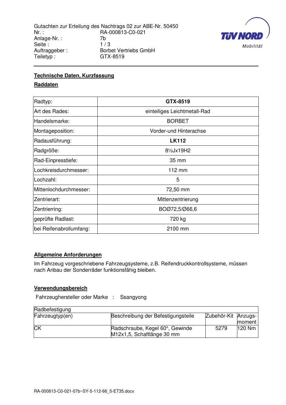 Dieses Gutachten (abe) bezieht sich auf die Alufelge brand-borbet GTX-8519 in der Ausführung ET 0, Mittenloch 0 mm (KBA 50450). Im PDF findest du typischerweise zulässige Reifengrößen, Auflagen/Anbauhinweise und – je nach Dokument – Hinweise zur Eintragung.