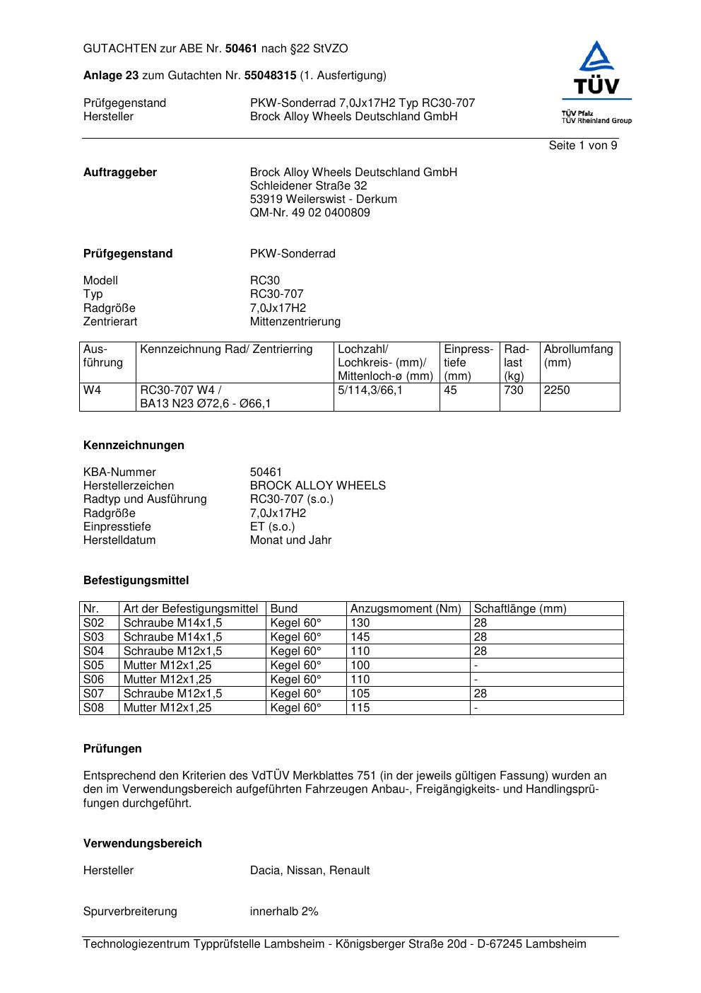 Dieses Gutachten (abe) bezieht sich auf die Alufelge Brock RC30-707 in der Ausführung 7Jx17 ET 0, Mittenloch 0 mm (KBA 50461). Im PDF findest du typischerweise zulässige Reifengrößen, Auflagen/Anbauhinweise und – je nach Dokument – Hinweise zur Eintragung.