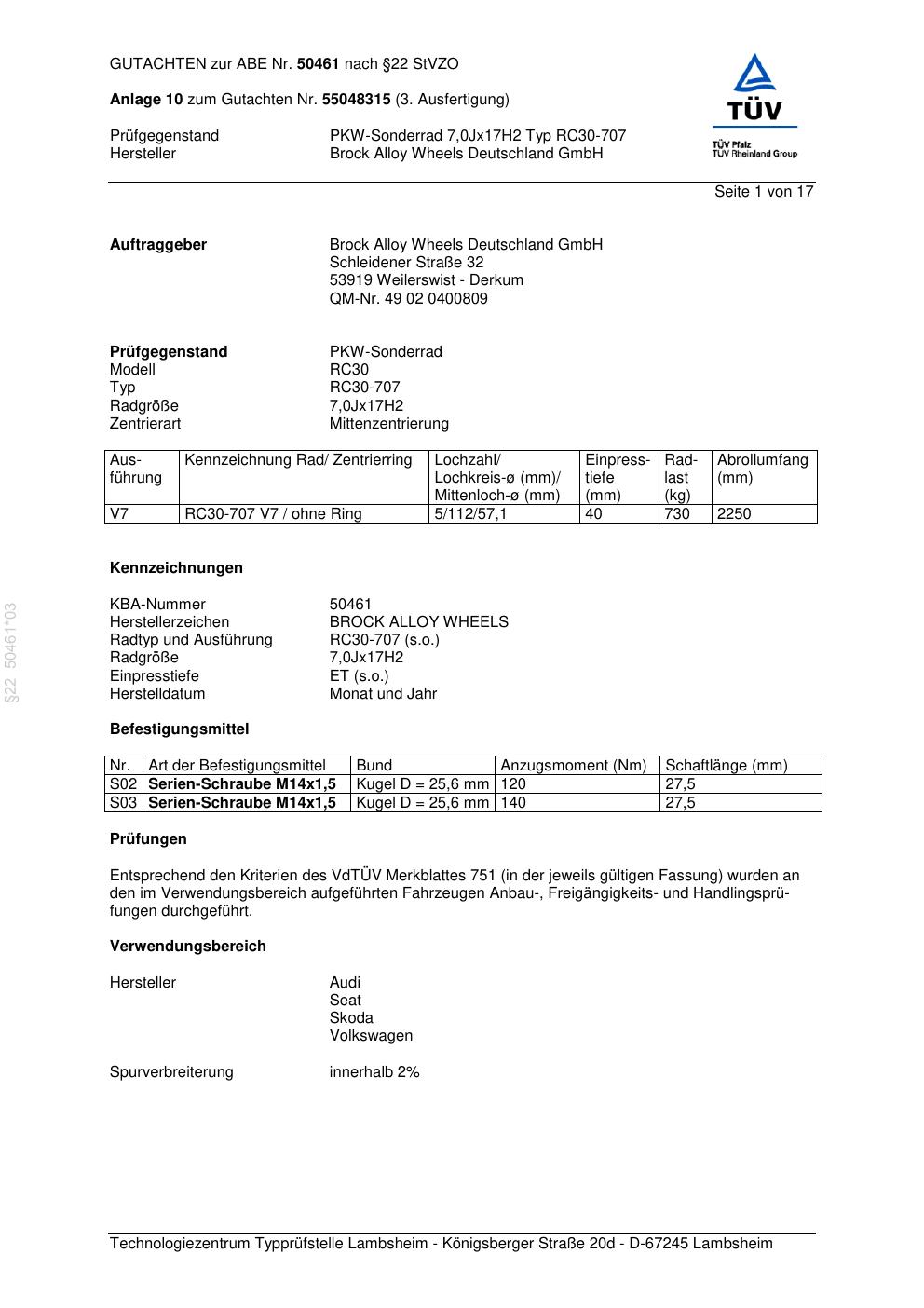Dieses Gutachten (abe) bezieht sich auf die Alufelge Brock RC30-707 in der Ausführung 7Jx17 ET 0, Mittenloch 0 mm (KBA 50461). Im PDF findest du typischerweise zulässige Reifengrößen, Auflagen/Anbauhinweise und – je nach Dokument – Hinweise zur Eintragung.