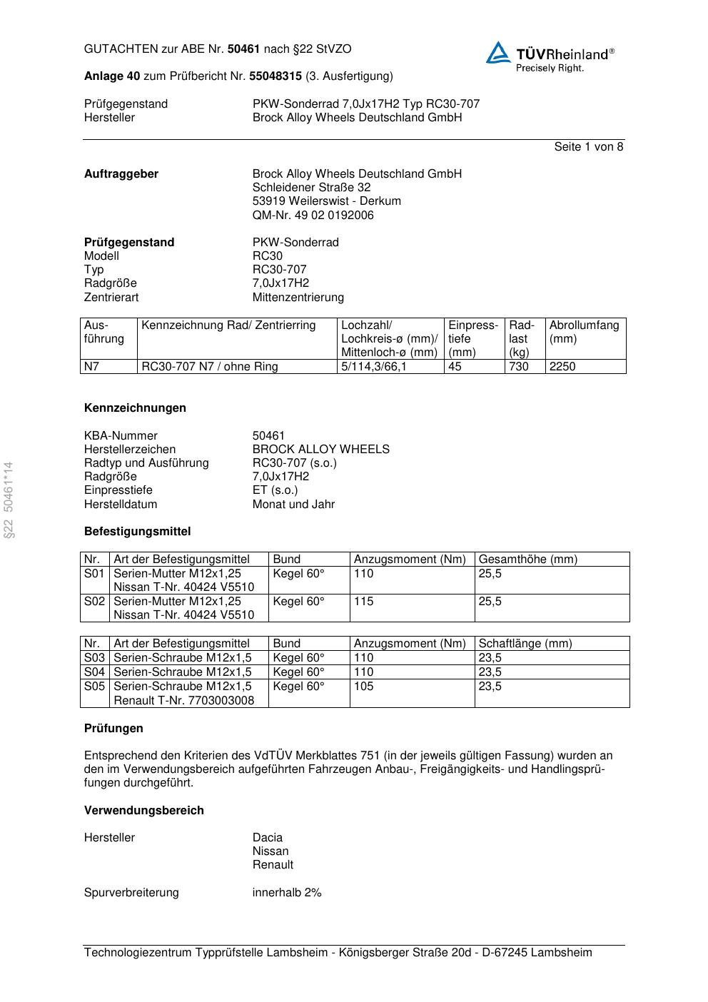 Dieses Gutachten (abe) bezieht sich auf die Alufelge Brock RC30-707 in der Ausführung 7Jx17 ET 0, Mittenloch 0 mm (KBA 50461). Im PDF findest du typischerweise zulässige Reifengrößen, Auflagen/Anbauhinweise und – je nach Dokument – Hinweise zur Eintragung.