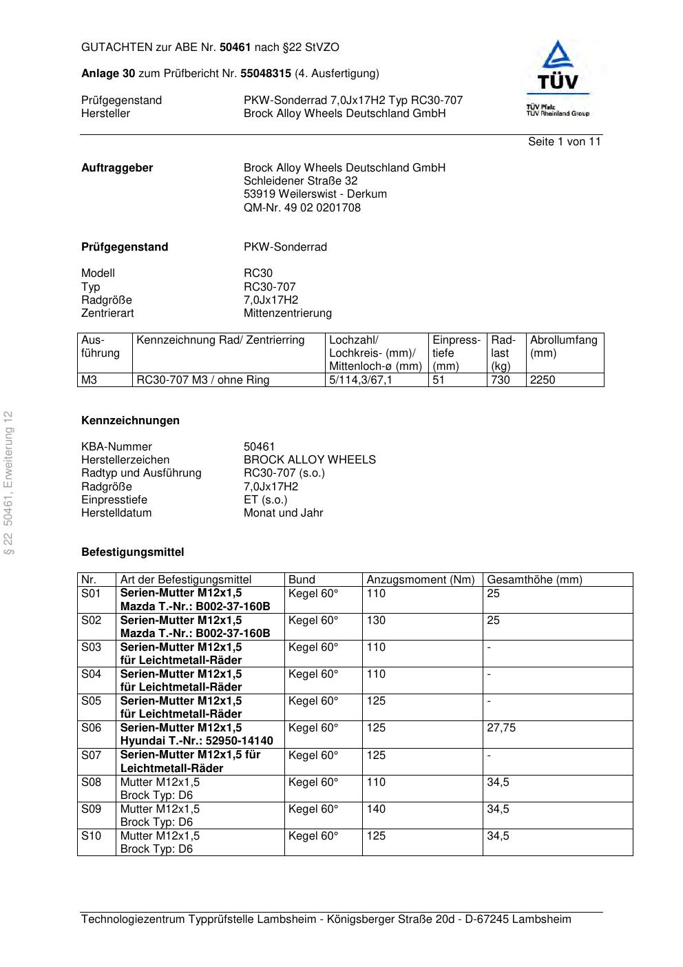 Dieses Gutachten (abe) bezieht sich auf die Alufelge Brock RC30-707 in der Ausführung 7Jx17 ET 0, Mittenloch 0 mm (KBA 50461). Im PDF findest du typischerweise zulässige Reifengrößen, Auflagen/Anbauhinweise und – je nach Dokument – Hinweise zur Eintragung.