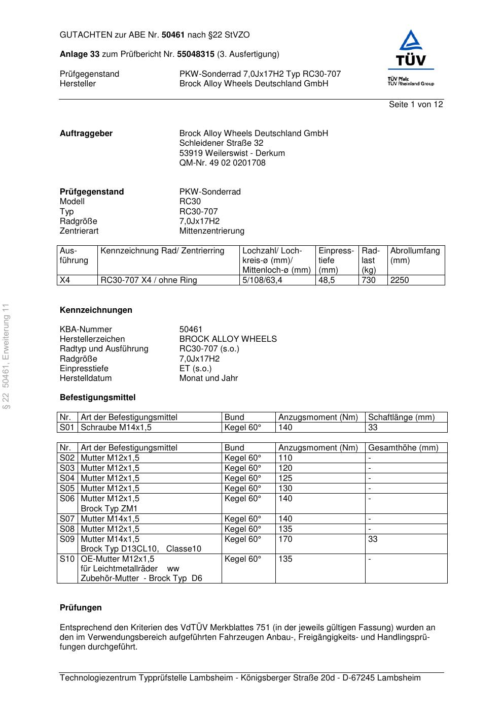 Dieses Gutachten (abe) bezieht sich auf die Alufelge Brock RC30-707 in der Ausführung 7Jx17 ET 0, Mittenloch 0 mm (KBA 50461). Im PDF findest du typischerweise zulässige Reifengrößen, Auflagen/Anbauhinweise und – je nach Dokument – Hinweise zur Eintragung.