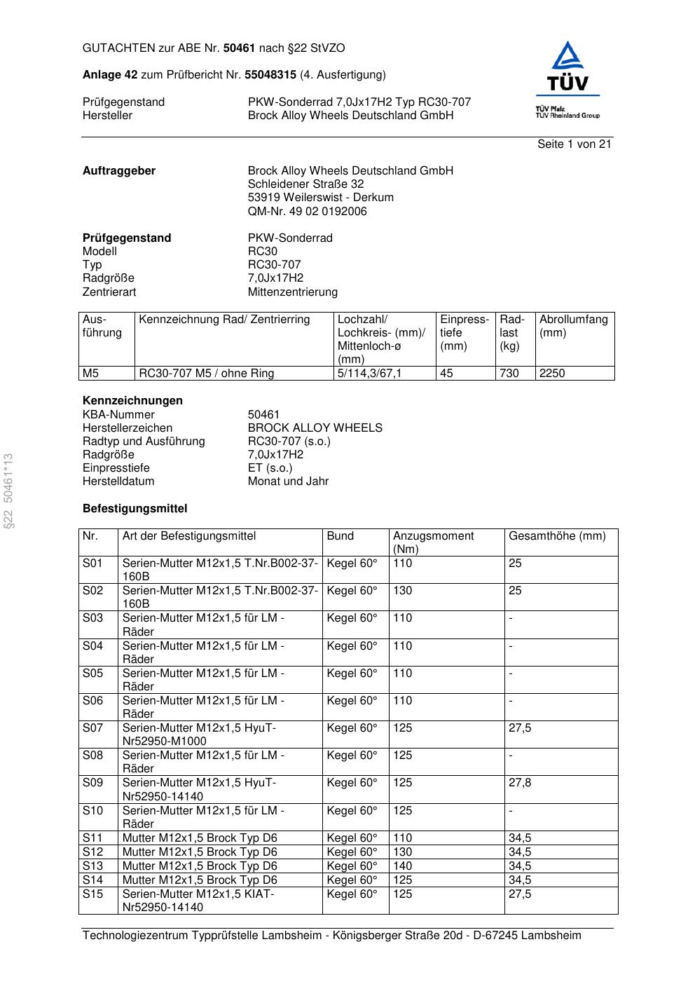 Dieses Gutachten (abe) bezieht sich auf die Alufelge Brock RC30-707 in der Ausführung 7Jx17 ET 0, Mittenloch 0 mm (KBA 50461). Im PDF findest du typischerweise zulässige Reifengrößen, Auflagen/Anbauhinweise und – je nach Dokument – Hinweise zur Eintragung.