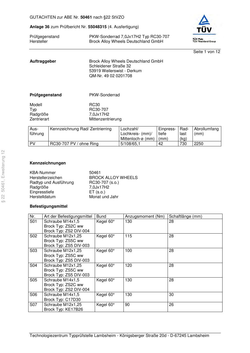 Dieses Gutachten (abe) bezieht sich auf die Alufelge Brock RC30-707 in der Ausführung 7Jx17 ET 0, Mittenloch 0 mm (KBA 50461). Im PDF findest du typischerweise zulässige Reifengrößen, Auflagen/Anbauhinweise und – je nach Dokument – Hinweise zur Eintragung.